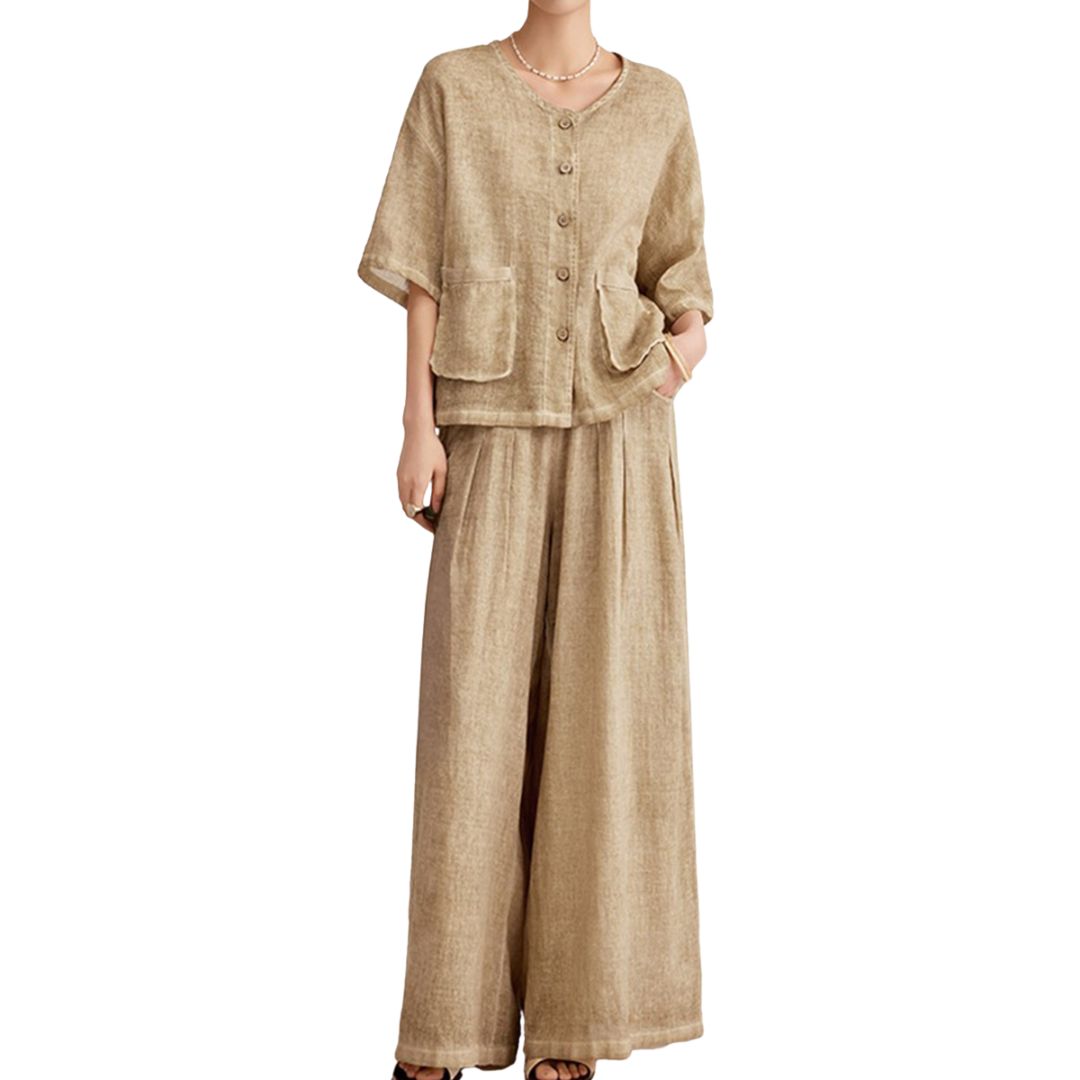 - Tailored for Real Life - The relaxed button-up top features a gentle A-line silhouette that flatters without clinging, while wide-leg pants with an elastic waist offer full comfort with refined polish.