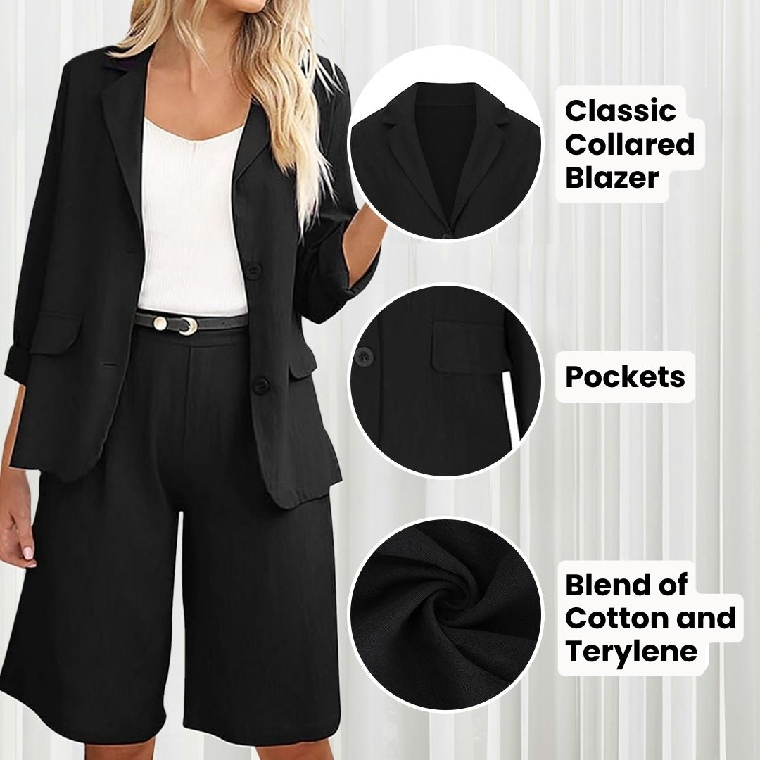 - Dignified but not Uptight: The classic collared blazer and knee-length, high-waisted shorts are classy and put-together, but the soft and natural fabric is friendly and approachable.