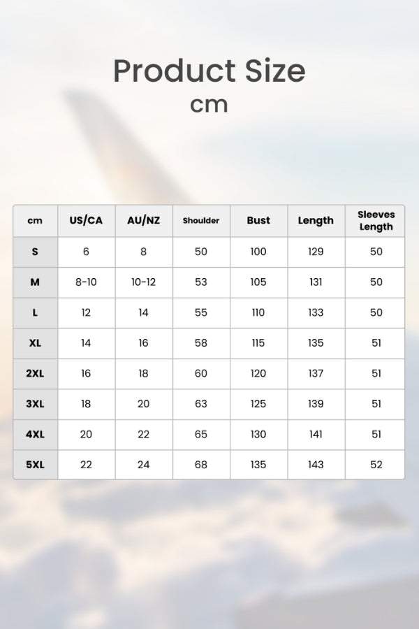| Size | US/CA | AU/NZ | Shoulder | Bust | Length | Sleeves Length |
