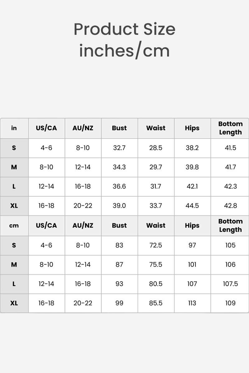 | Size | US/CA | AU/NZ | Bust | Waist | Hips | Bottom Length |