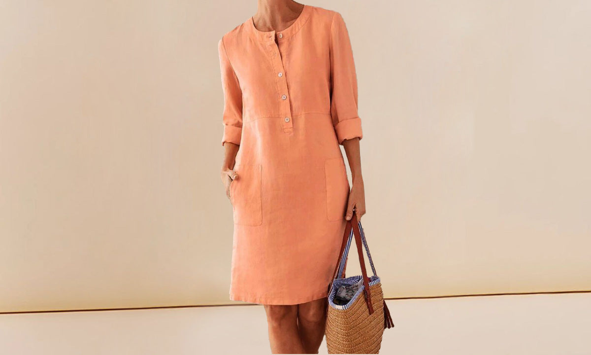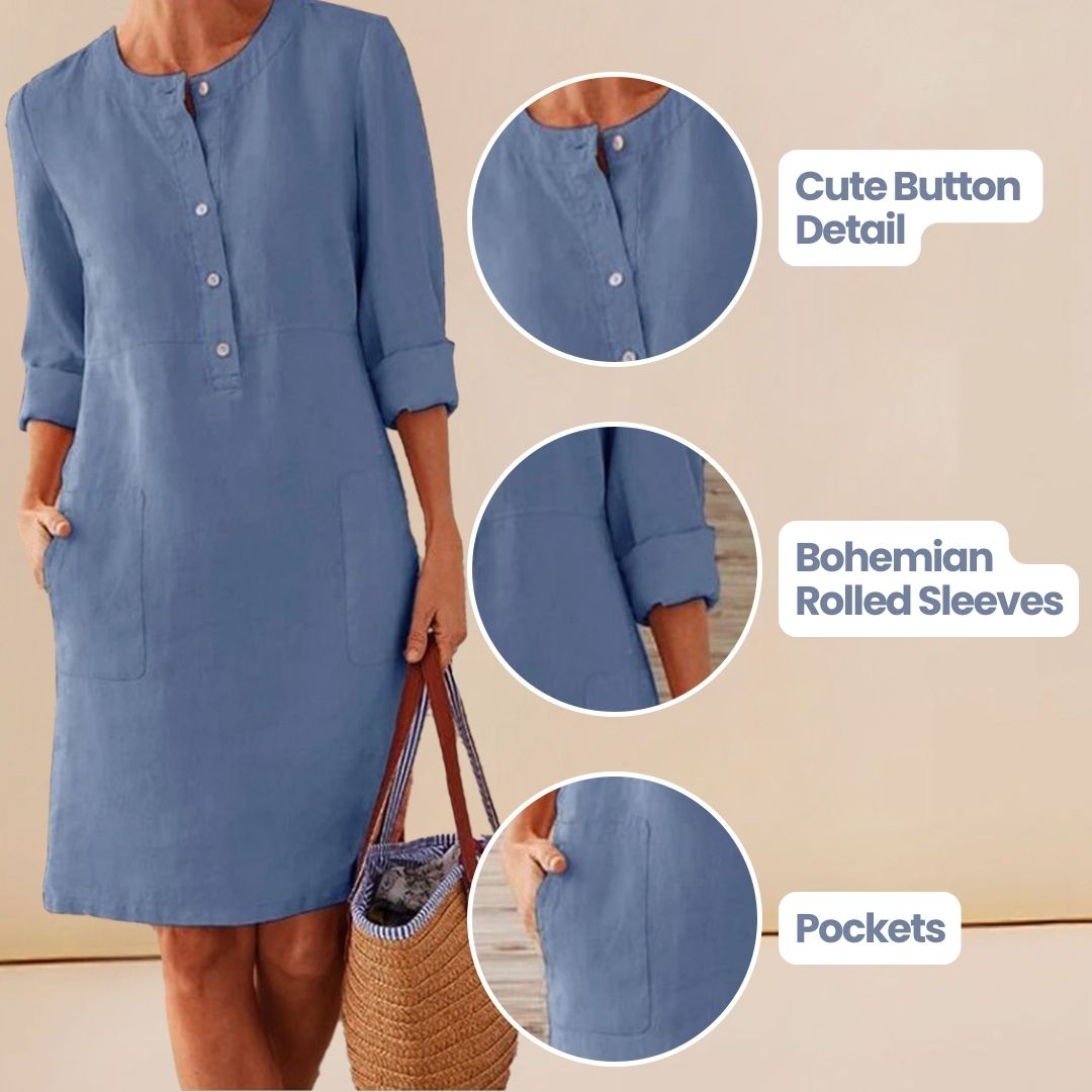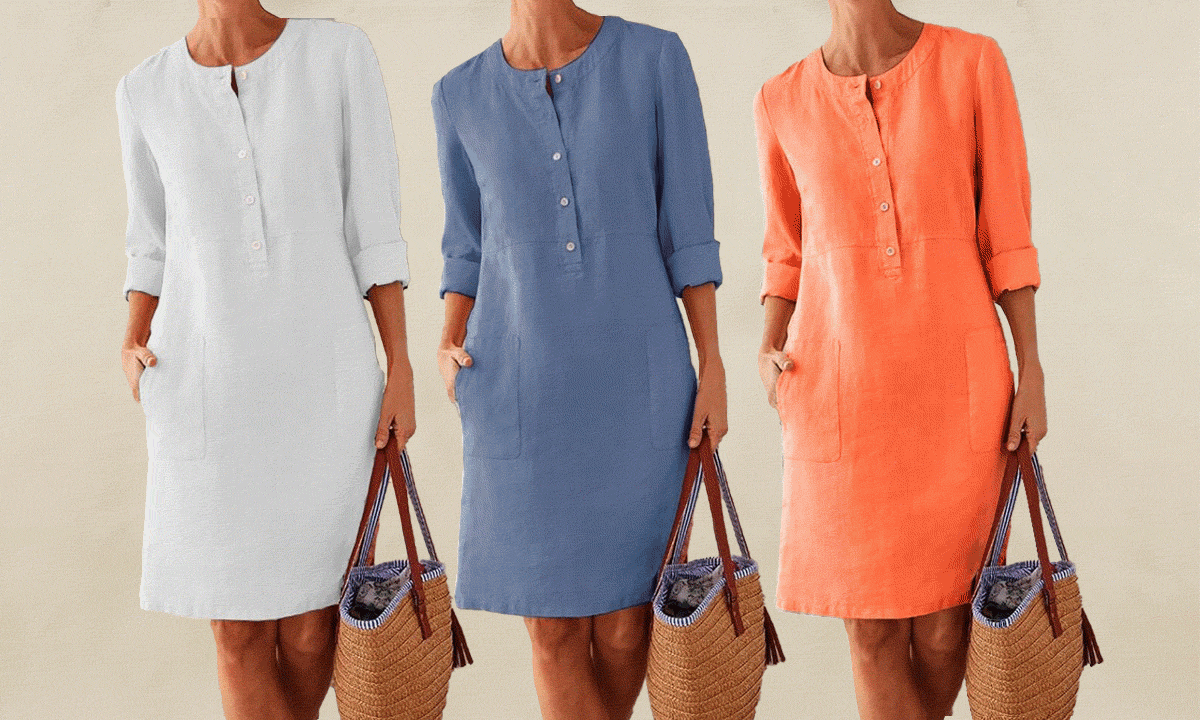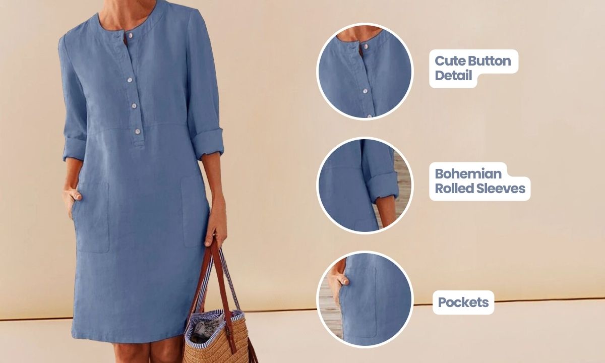Design Elements: Half-button front, Rolled ¾ sleeves, Knee-length