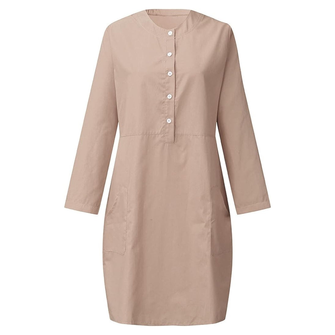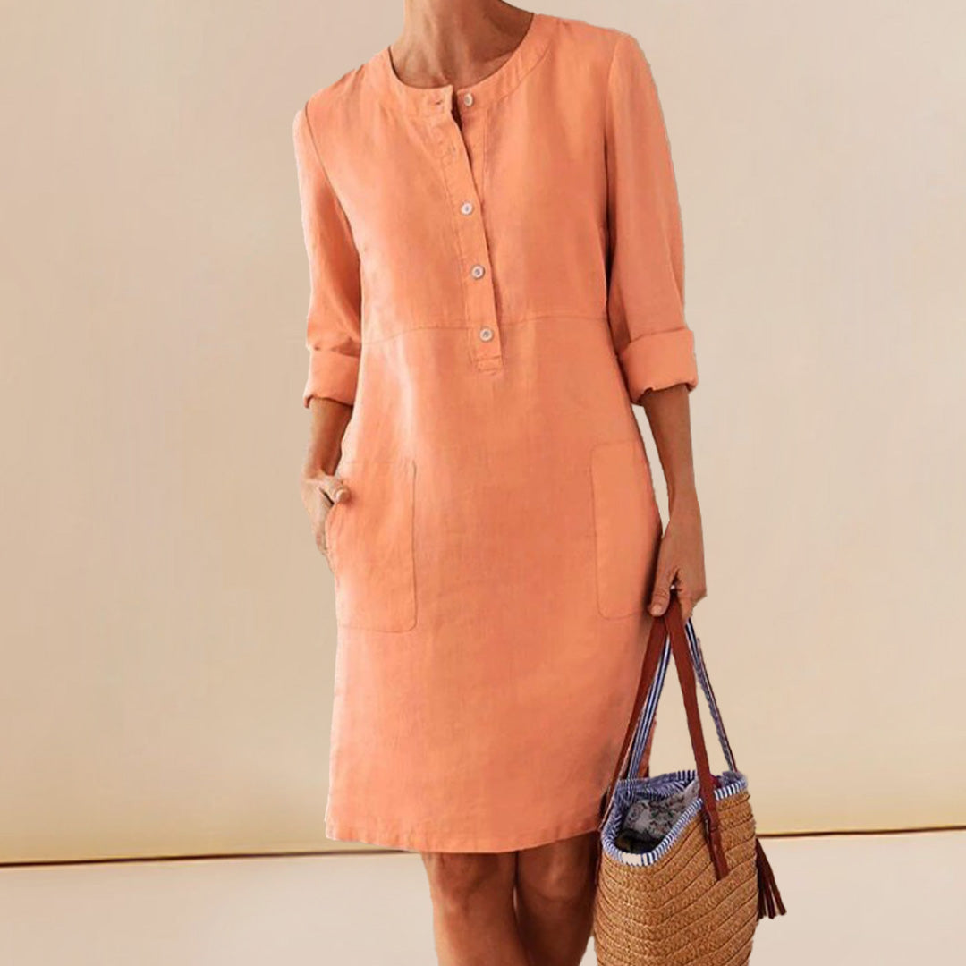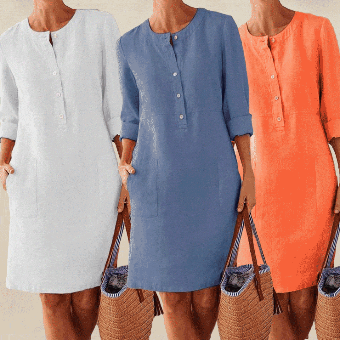 Design Elements: Half-button front, Rolled ¾ sleeves, Knee-length