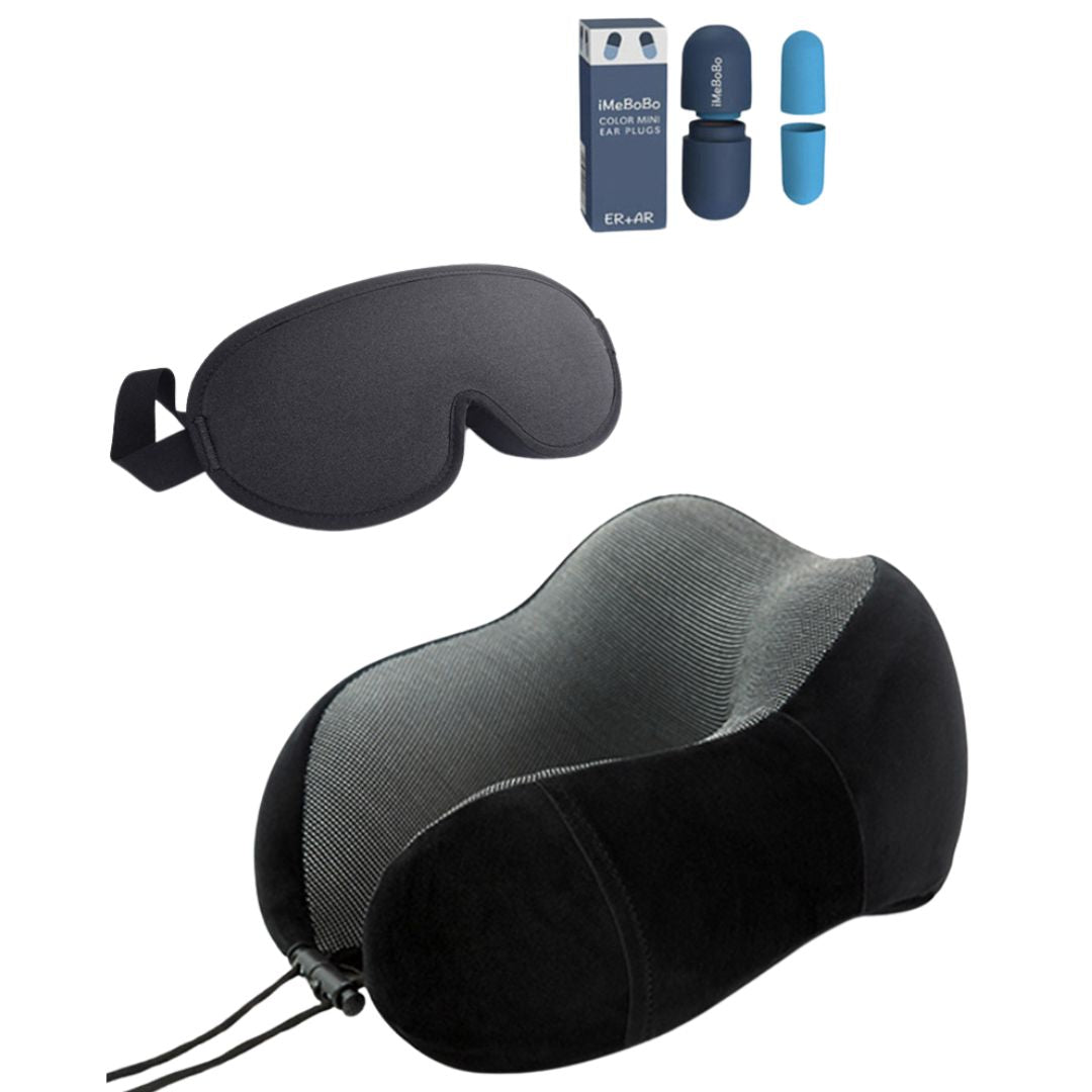 includes a memory foam neck pillow, a blackout eye mask, and noise-blocking earplugs