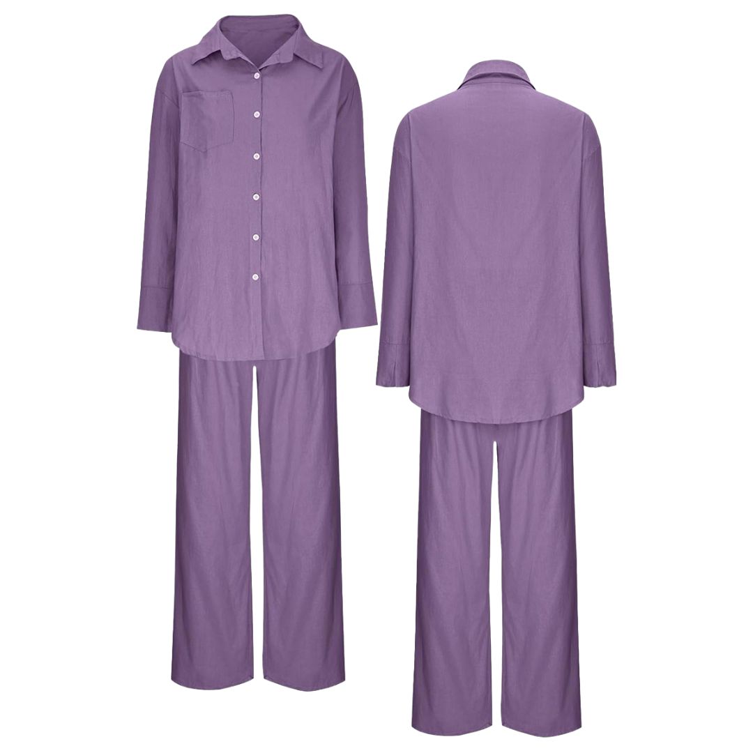 This set features a relaxed fit with an oversized button-up top and wide-leg pants, creating an elegant silhouette that's flattering and comfortable.