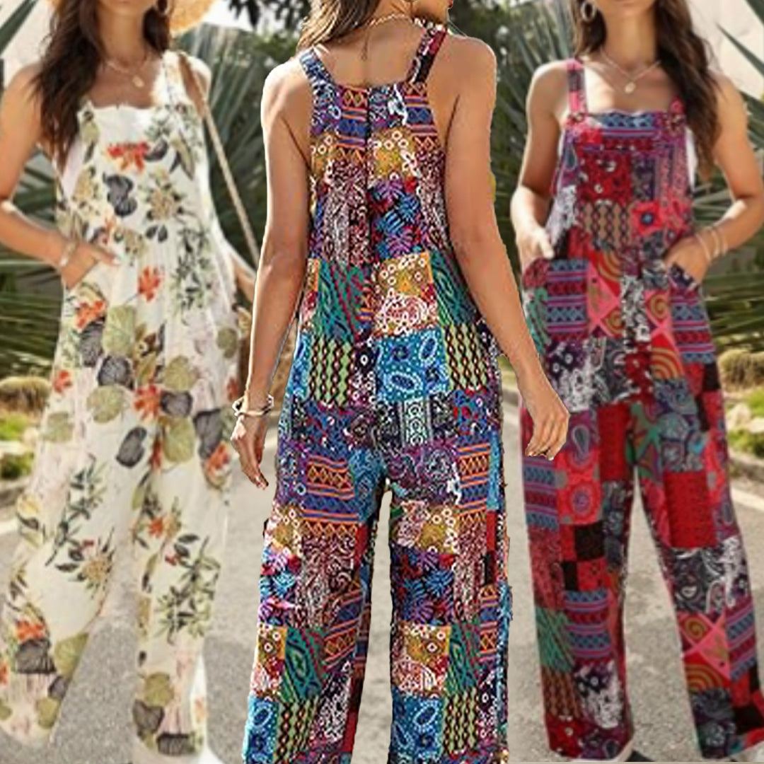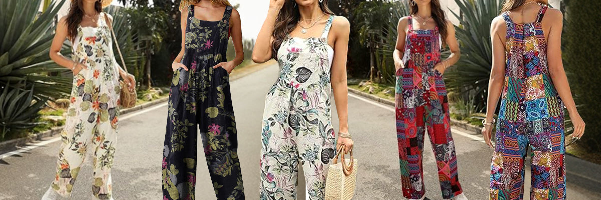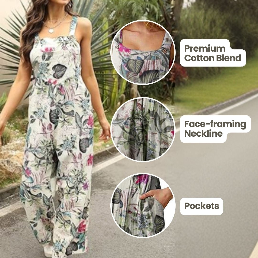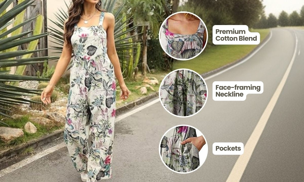 Design Elements: Square neck, Button detail on straps, Two pockets, Wide-legged